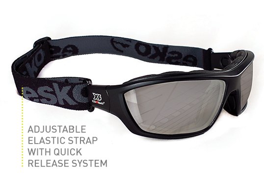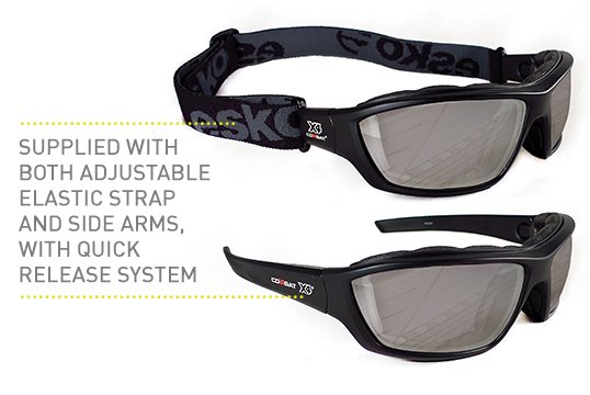 - Supplied with both adjustable elastic strap or side arms - quick release system