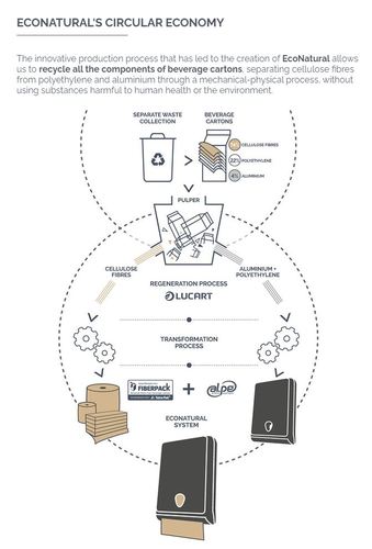 Thanks to its innovative technology, EcoNatural by Lucart seperates the individual components of beverage cartons. From cellulose fibres, Lucart develops Fibrepack used to make EcoNatural, the paper that provides all the strength, absorbency and softness of a premium product with the guarantee of a safe and certified range. With aluminium and polythylene, Lucart makes Al.Pe, the raw material used to produce the dispensers for every washroom and healthcare area
