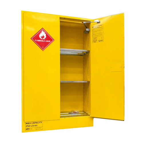 Double door flammable liquid storage cabinet with 250L capacity.