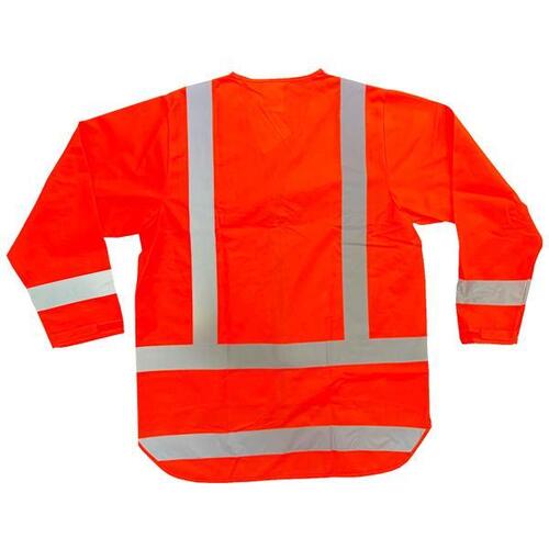 High visibility vest in fluorescent orange with an extra-long tail and additional reflective tape.