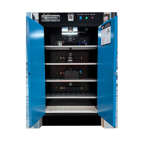Built with double steel walls featuring a 40mm gap, it meets FM6050, OSHA 1910.106, and NFPA 30 standards. Enjoy smart charging, real-time temperature and humidity monitoring, and an adjustable exhaust fan, along with four adjustable shelves offering 32 lightning-protected sockets.