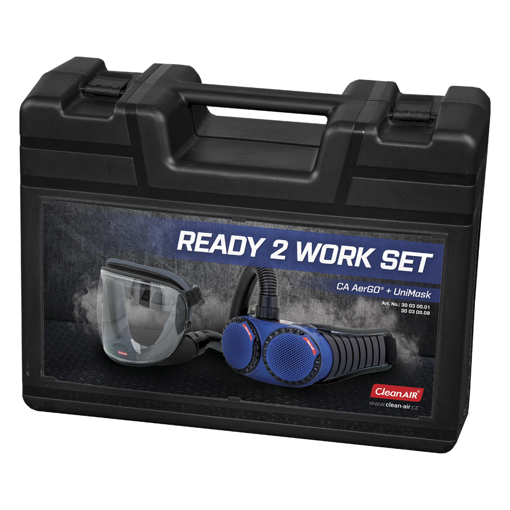 Ready 2 Work Set includes UniMask face shield, CleanAIR AerGO PAPR and Quicklock hose, all packed in a hard shell box for easy carrying.