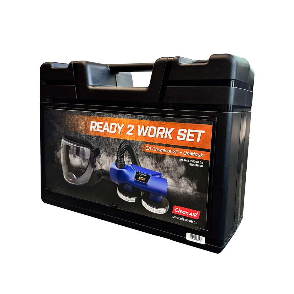 Ready 2 Work Set includes UniMask face shield, CleanAIR Chemical 2F PAPR, one pair of P3 filters, Quicklock hose and free hard case.