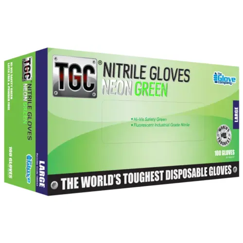 Be Safe, Be Seen with TGC® Neon Green Nitrile Disposable Gloves. The boldest, ultra-tough advanced safety disposable gloves.